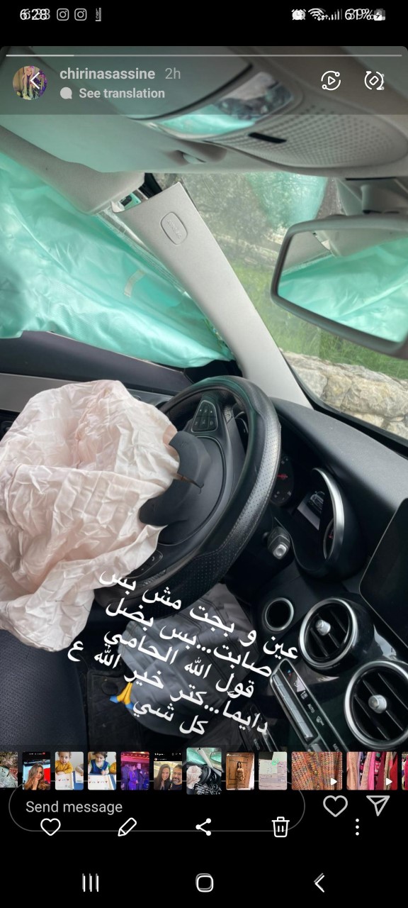 ونشرت شيرين صورة عبر خاصية “الستوري” على حسابها الخاص على “انستغرام” من داخل السيارة أظهرت الأضرار التي لحقت بها جراء الحادث، وعلقت عليها بالقول: “عين وبجت مش بس صابت.. بس بضل قول الله الحامي دايما. كتر خير الله عكل شي”.