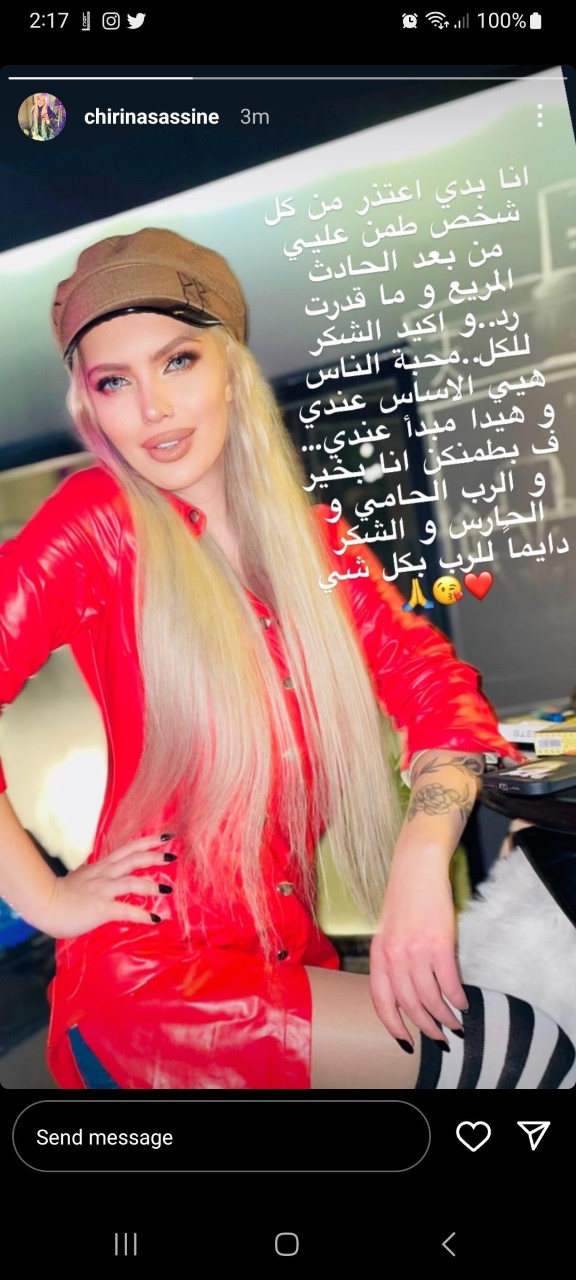ثم نشرت شيرين لاحقا صورة أخرى علقت عليها قائلة: “بدي اعتذر من كل شخص طمن عليي من بعد الحادث المريع وما قدرت رد. واكيد الشكر للكل. محبة الناس هيي الأساس عندي وهيدا مبدأ عندي. فبطمنكن انا بخير والرب الحامي والحارس والشكر دايما للرب بكل شي”.